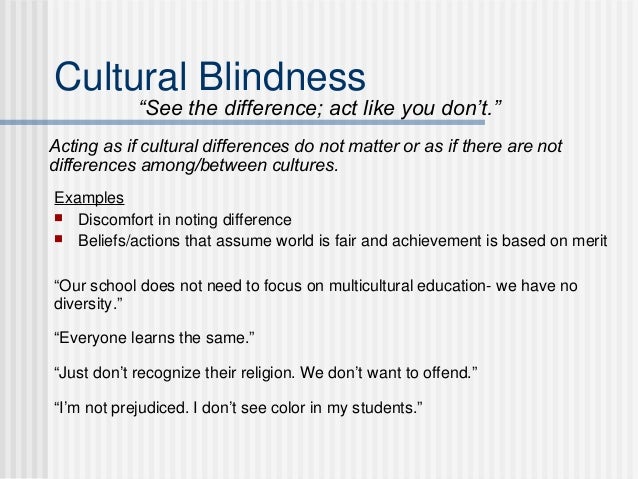 Cultural blindness being fair by treating everyone the same is often hard to view as problematic. Initial levels of awareness after which a personorganization can move in positive constructive direction or they can falter stop and possibly regress. Kulturelle Blindheit cultural blindness Definition.